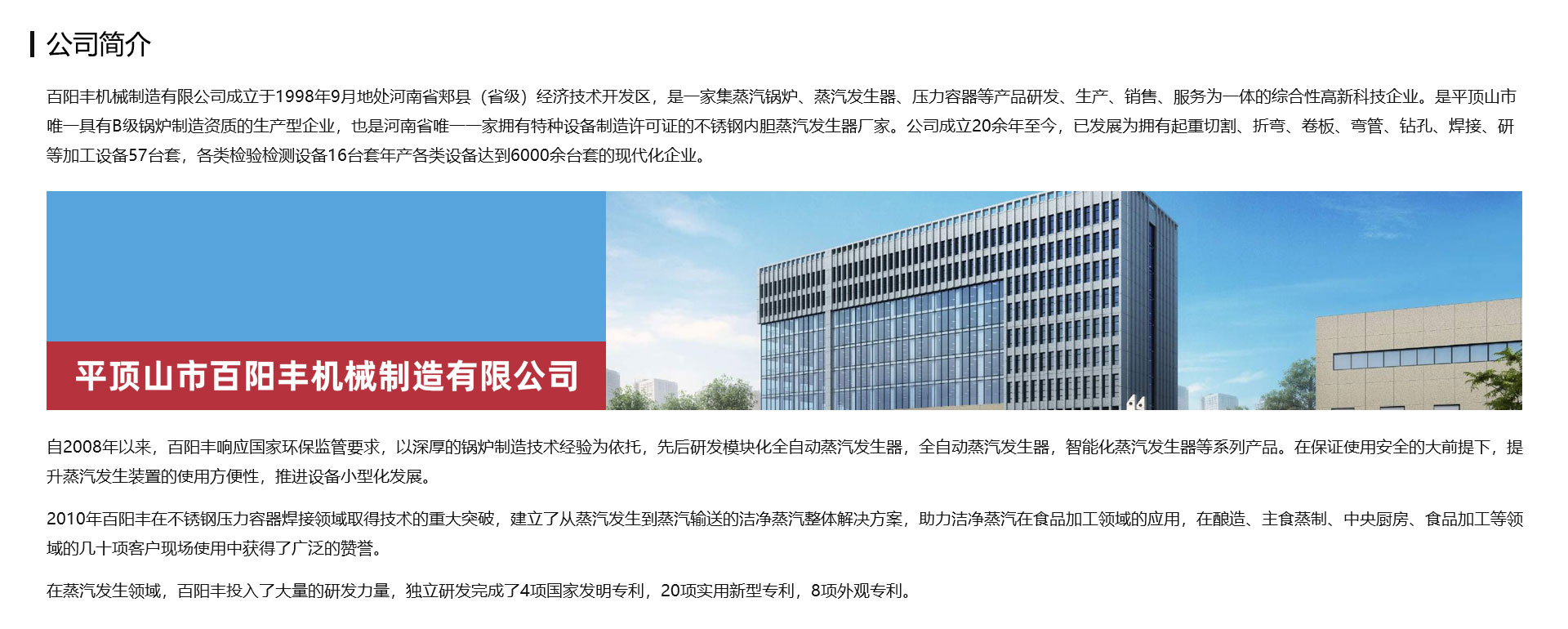 百陽豐機(jī)械制造有限公司成立于1998年9月地處河南省郟縣(省級)經(jīng)濟(jì)技術(shù)開發(fā)區(qū),是一家集蒸汽鍋爐、蒸汽發(fā)生器、壓力容器等產(chǎn)品研發(fā)、生產(chǎn)、銷售、服務(wù)為一體的綜合性高新科技企業(yè)。是平頂山市一家具有B級鍋爐制造資質(zhì)的生產(chǎn)型企業(yè),也是一家擁有特種設(shè)備制造許可證的不銹鋼內(nèi)膽蒸汽發(fā)生器廠家。公司成立20余年至今,已發(fā)展為擁有起重切割、折彎、卷板、彎管、鉆孔、焊接、研等加工設(shè)備57臺套,各類檢驗(yàn)檢測設(shè)備16臺套年產(chǎn)各類設(shè)備達(dá)到6000余臺套的現(xiàn)代化企業(yè)。